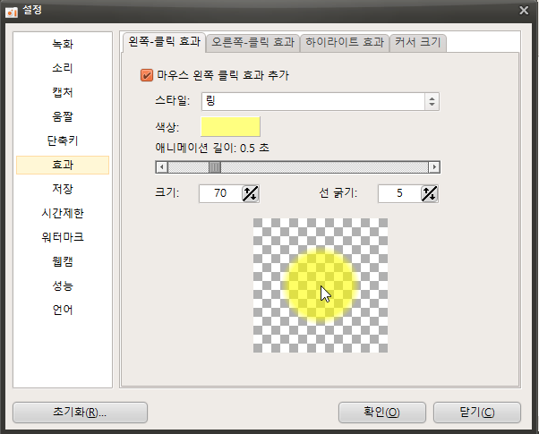 효과 메뉴에 들어가면 상단에 마우스 클릭할 때마다 하이라이트 효과를 넣을 수 있습니다.