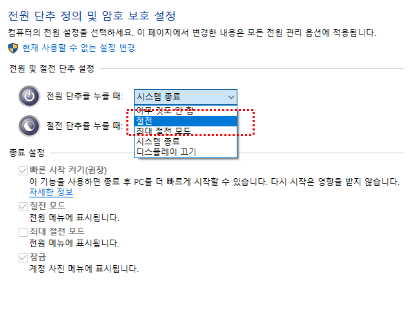 저는 전원 단추를 누를 때 절전 모드로 변경하게 끔 설정했습니다.