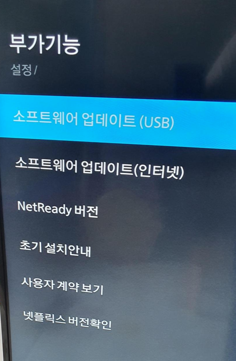 3. TV 리모컨으로 설정- 부가기능 - 소프트웨어 업데이트(USB 설정)를 선택하여 업데이트 진행